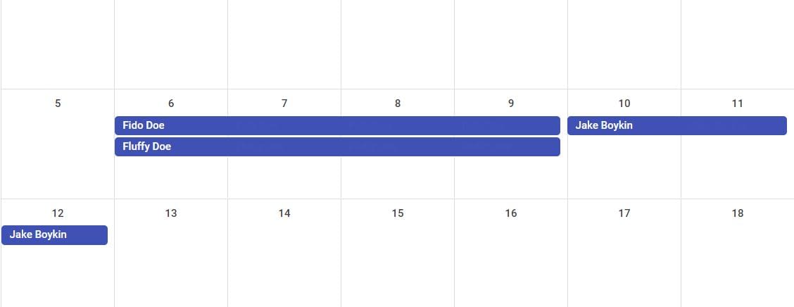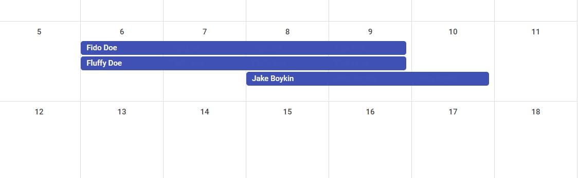 One set of client’s dog per given set of dates is OK to begin, note how they do not overlap.